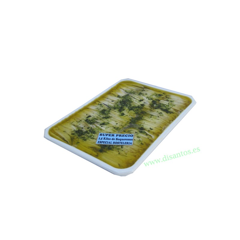 Los boquerones en vinagre son uno de los aperitivos mas frecuentes y valorados en los bares, restaurantes y terrazas del Sur. Su principal ingrediente lógicamente son los boquerones, una especie de pescado (el mismo que la anchoa) de pequeñas dimensiones (20 cm) que una vez limpio y sacados sus lomos los marinamos en vinagre y en abundante ajo y perejil, según el gusto de consumidor. Suele servirse con cerveza o refrescos, sobre unas patatas fritas (chips o de bolsa) en montaditos o bocadillos, solos o combinados con atún o anchoas. Este formato es especial para bares y restaurantes, con la cantidad justa para un par de bandejas de barra, disfrute de su gran calidad y su excelente sabor. Este producto esta libre de anisakis. Es un alimento muy saludable y tiene muchas proteínas.