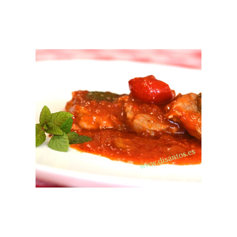Comida casera de calidad. Plato tradicional manchego, un buen pisto manchego, aderezado con la mejor pieza del cerdo, el solomillo, partido en pequeños medallones cocinados a fuego lento, dejandolos infusionar con el pisto para que se mezclen los sabores y el sabor se insuperable. Cada bandeja de 1.6 kilos contiene entre 15 y 16 medallones.
