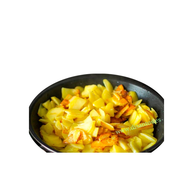 Patatas a lo pobre, patatas al monton, patatas fritas, patatas fritas para tortilla, llamálas como más te guste, son unas patatas fritas cocinadas lentamente, envasadas en atmosfera protectora con su aceite. Utilizalas a tu gusto, para guarnicion, para tortilla, con un par de huevos fritos... es un producto de mucha ayuda en la cocina, con solo calentar tienes una solucion impresionante. Comida preparada de calidad.