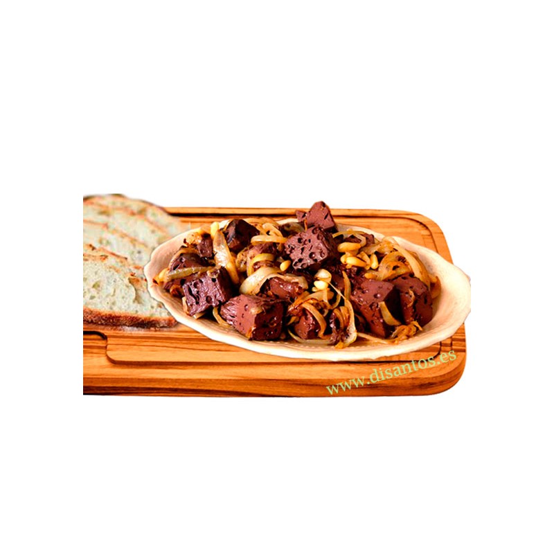 Este plato es algo especial, no es una receta. Te puede parecer un plato raro, pero no dejes de probarlo. Es sangre de pollo cocida, cortada en pequeños dados, cocinada con cebolla en juliana. Es un aperitivo muy tipico de la zona del levante, sobre todo de la region Murciana. Comida cocinada de calidad