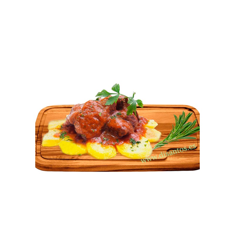 Es un plato típico Español, aunque su denominación es esa, normalmente se elabora con rabo de añojo o ternera, lo cual no influye en el resultado final. Es un plato laborioso y de cocinar lento, no menos de 5 horas a fuego lento. Luego el resultado es espectacular, tierno, jugoso y riquísimo, es algo ha lo que es fácil aficionarse. Un plato con trapio y fundamento. Ponerlo en su mesa o restaurante es tan sencillo como contactar con nos8. Comida preparada de calidad. Disfrute de la mejor comida casera.