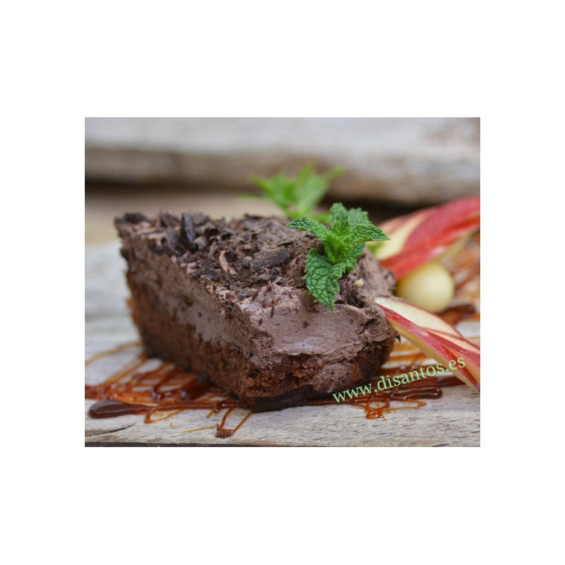 La delicia de los golosos, bizcocho casero de chocolate, regado con una crema de chocolate, caladito, sin pasarse. Añadimos crujientes trocitos de chocolate negro 100%, montamos una mousse de chocolate casera y le ponemos la guinda con un reguero de perlas de chocolate negro, rica rica pero no empacha.