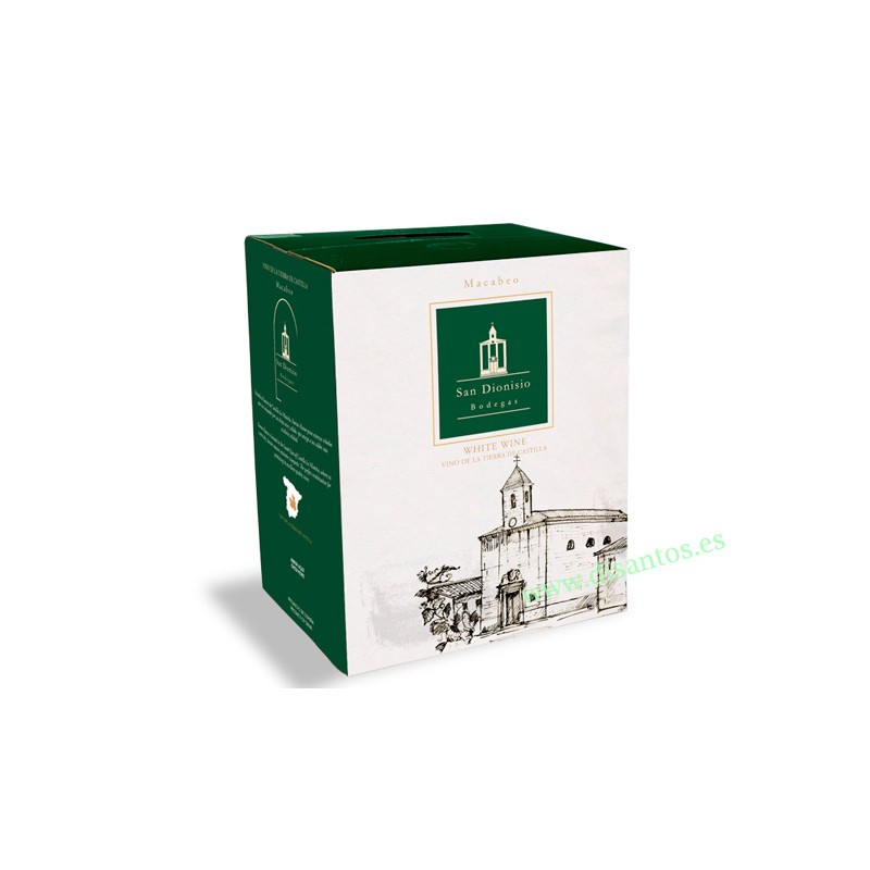 Vino blanco Macabeo, vino de la Tierra de Castilla. Envasado en bolsas al vacío, dentro de caja de carton con un grifo. Larga conservación después de realizar el primer servicio. Muy cómodo. Excelente Vino de mesa.